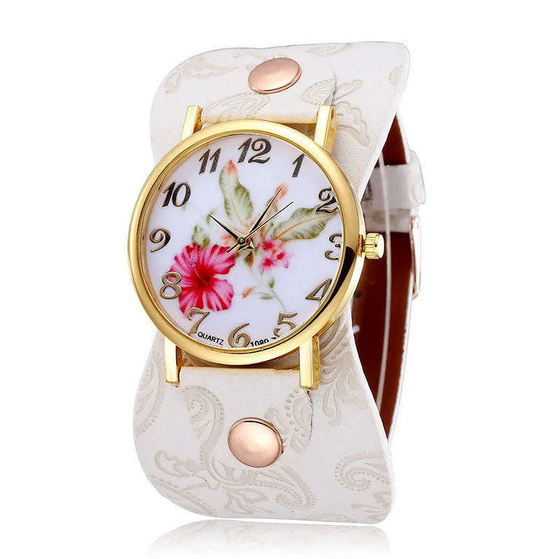 0 Comments for "New Arrival Fower Design Fashion Casual Watch Quartz Leather Straps Watches Women Wrist Watch"