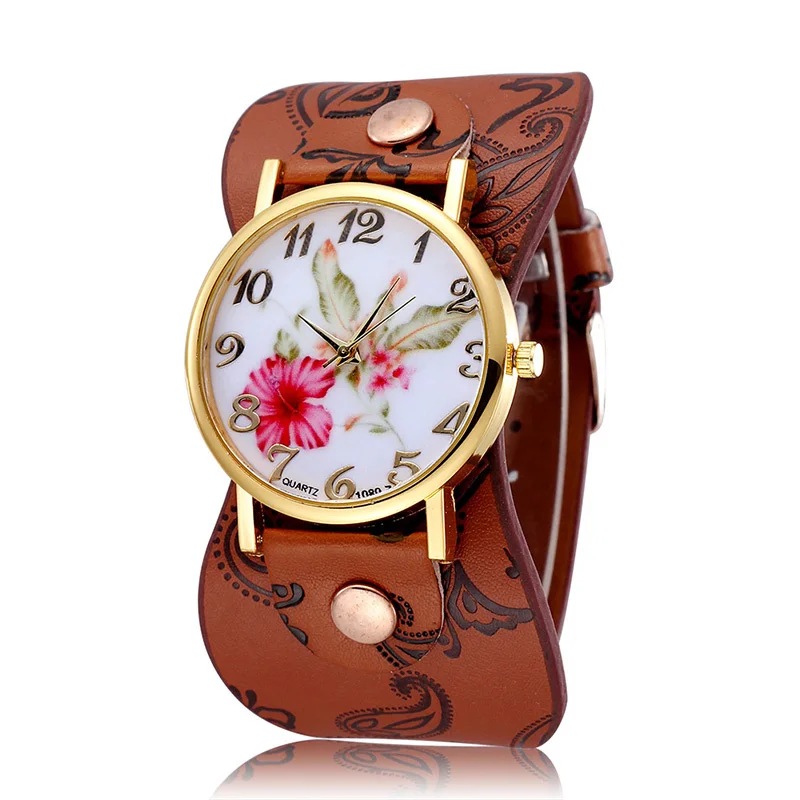 | New Arrival Fower Design Fashion Casual Watch Quartz Leather Straps Watches Women Wrist Watch |