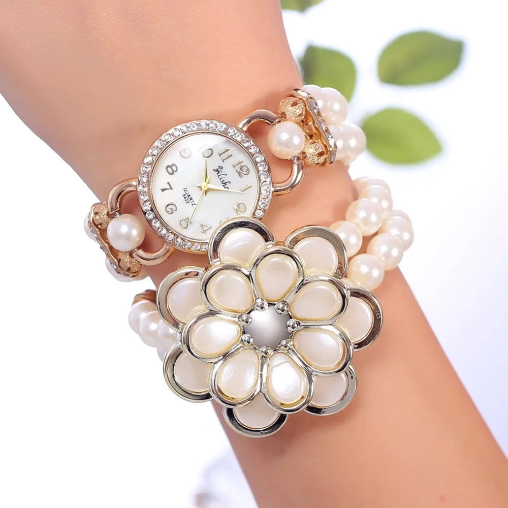 Best Price Comparison With New Listing Fashion Women Watch Fashion White Pearl Flower Plastic Bracelet Watch Women Quartz Rhinestone Watch Relogio Feminino