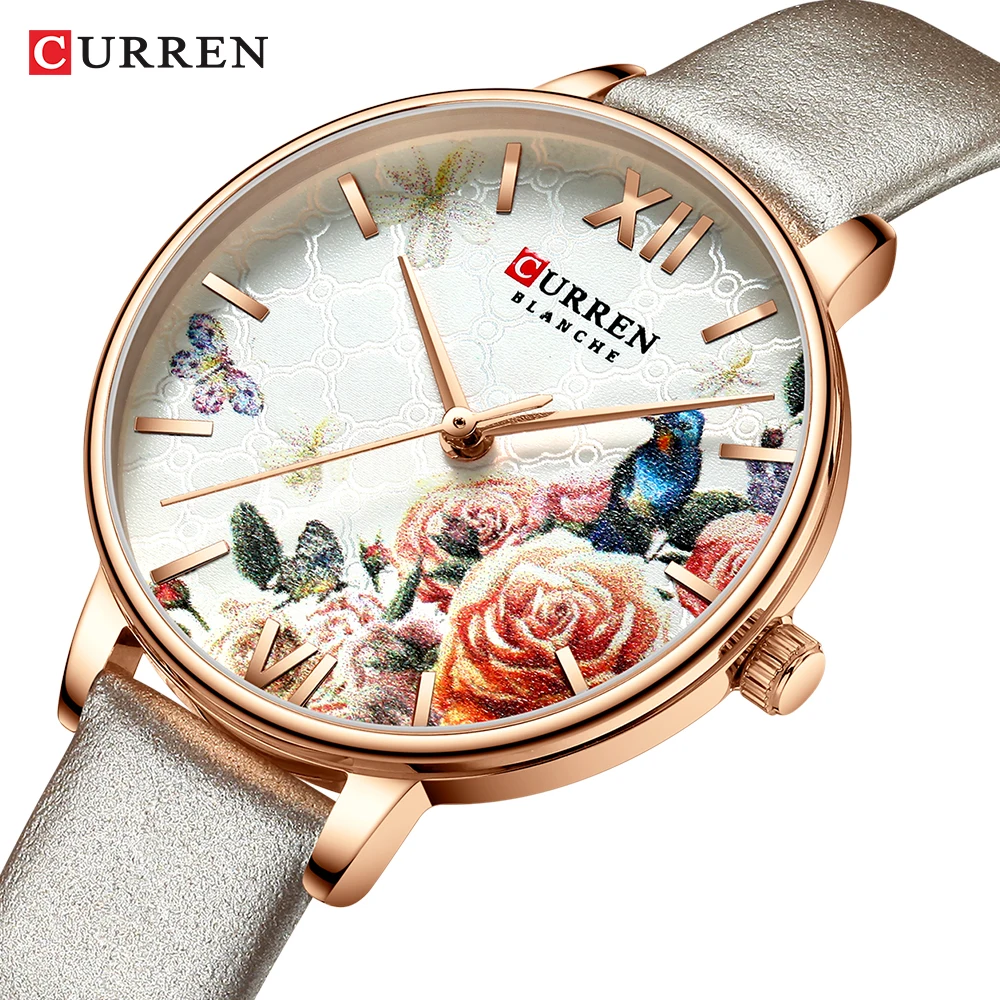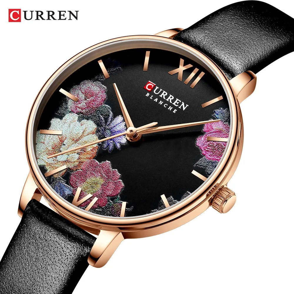 CURREN Beautiful Flower Design Watches Women Casual Leather Wristwatch Ladies Watch Fashion Female Clock Womens Quartz Watch